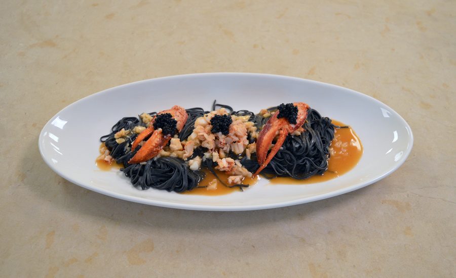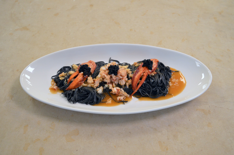 Tagliolini di pasta fresca al nero di seppia con bisque di gamberi, astice americano marinato e caviale siberiano.
