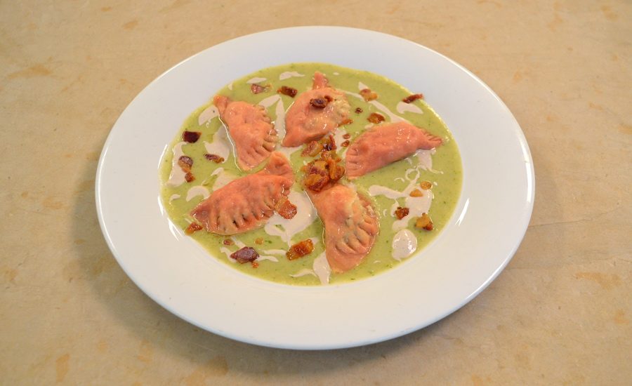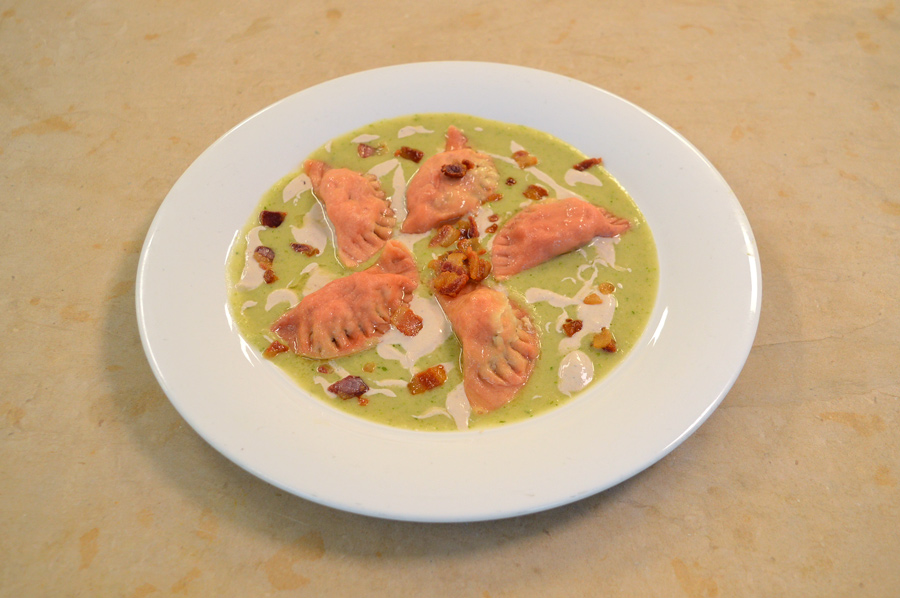 Ravioli rossi a mezzaluna fatti a mano con barbabietola, ripieni di pollo e pane, serviti con crema di lattuga Iceberg, salsa di acciughe piccanti e pancetta croccante.