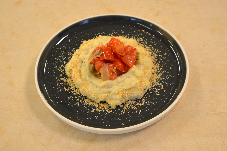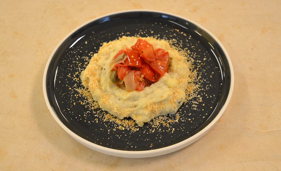 Baccalà su base di olio, cipolla bianca, basilico, aglio, latte e pepe, decorato con salsa di cipolla rossa sbianchita e pomodorini cotti con capperi, aglio, basilico e pan grattato con scorza di limone.