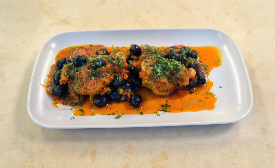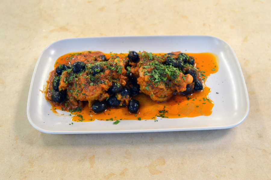Soffritto di sedano, carota e cipolla, pollo, pomodoro, spezie e olive nere.
