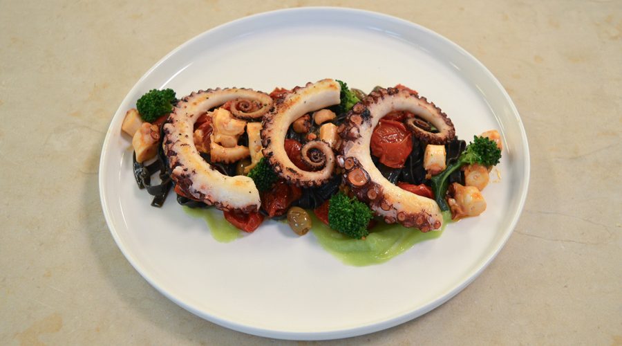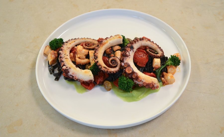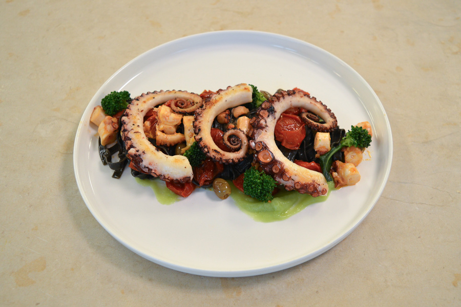 Pasta fresca al nero di seppia, polpo, pomodori confit, salsa di broccolo e broccoli sbollentati per decorazione.
