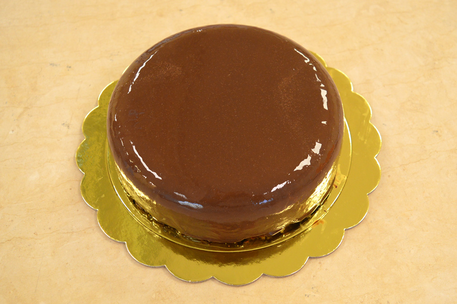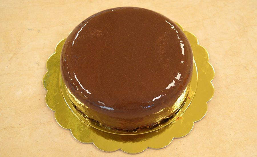 Biscuit bagnato all’alchermes, crema pasticcera classica e al cacao, secondo strato di biscuit sempre bagnato all’alchermes, il tutto avvolto da una mousse al cacao e ricoperto con glassa lucida al cacao.
