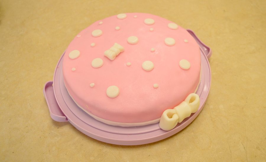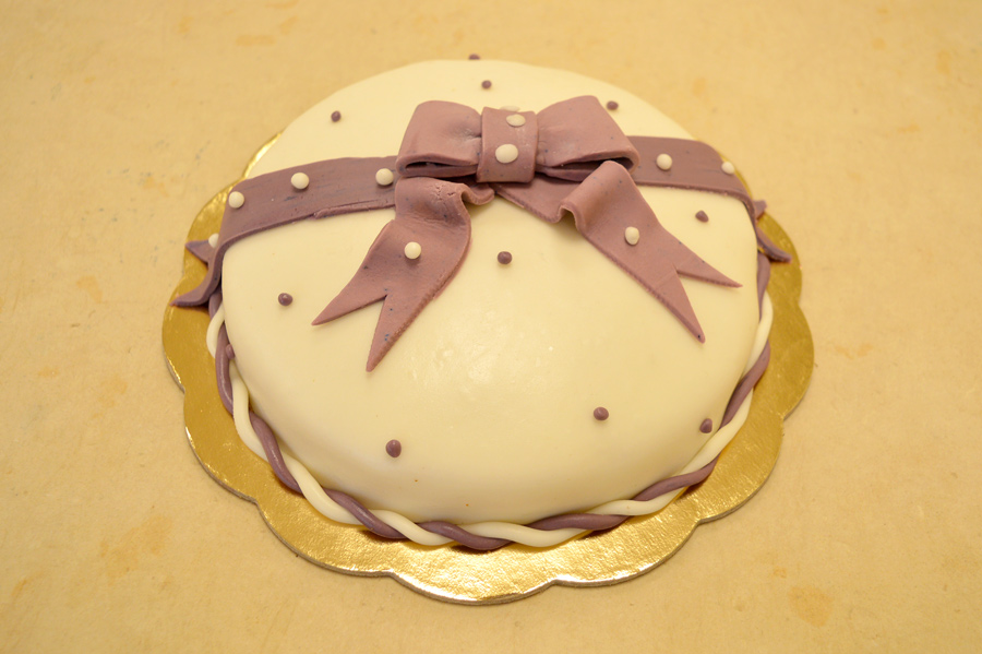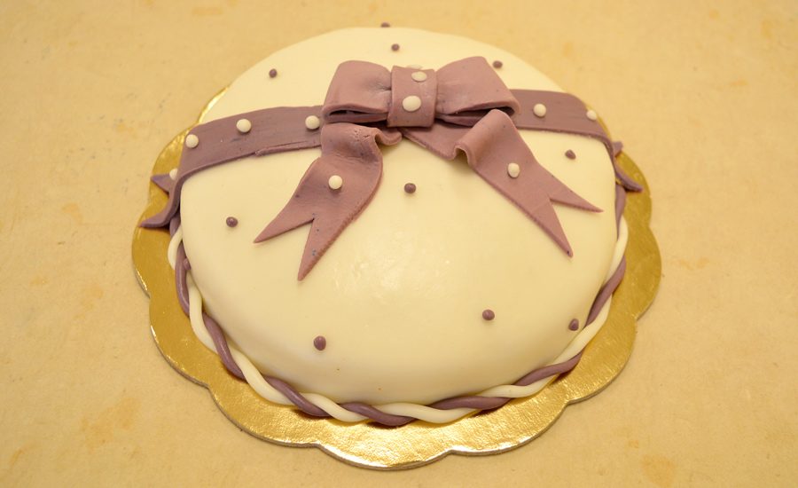 Pan di Spagna con crema pasticcera e gocce di cioccolato, copertura in pasta di zucchero decorata con un fiocco rosa di cioccolato.