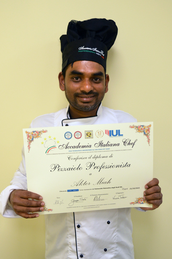 Nella sessione d’esame si è diplomato anche 1 bravissimo pizzaiolo: Akter Miah al quale è stato riconosciuto il diploma Accademico. Il Neo Diplomato ha dimostrato di aver raggiunto un ottimo livello di competenze professionali che gli consentiranno di affrontare con successo la carriera lavorativa futura. Il Diploma di Pizzaiolo Professionista è stato conseguito all’allievo dopo un percorso di lezioni teorico-pratiche presso l’Accademia, uno stage di 200 ore presso una Pizzeria, al quale poi ha fatto seguito la prova d’esame. Il bagaglio di conoscenze appreso sarà ora necessario per entrare nel mondo del lavoro, sia in Italia che all’estero.