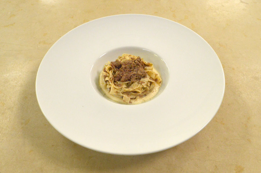 Andrea Nocito ha realizzato un primo piatto dal nome “in errore“. Una pasta fresca tagliatelle (500 gr di farina 00 + 500 gr farina semola x 15 tuorli e 6 albumi) su ragù di capriolo aromatizzato al tartufo, cotto in terracotta e sotto caprino stagionato 13 mesi.