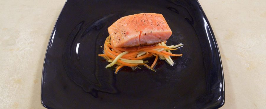 “E’ un piatto pratico con 3 textures nello stesso trancio di salmone, la scelta degli spaghetti di verdure per omaggiare l’Italia”.