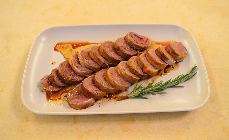 Filetto di manzo lardellato con pancetta affumicata, rosolato con burro e olio extravergine di oliva. Il fondo di cottura è aromatizzato con brandy, brodo di carne, rosmarino, sale e pepe.