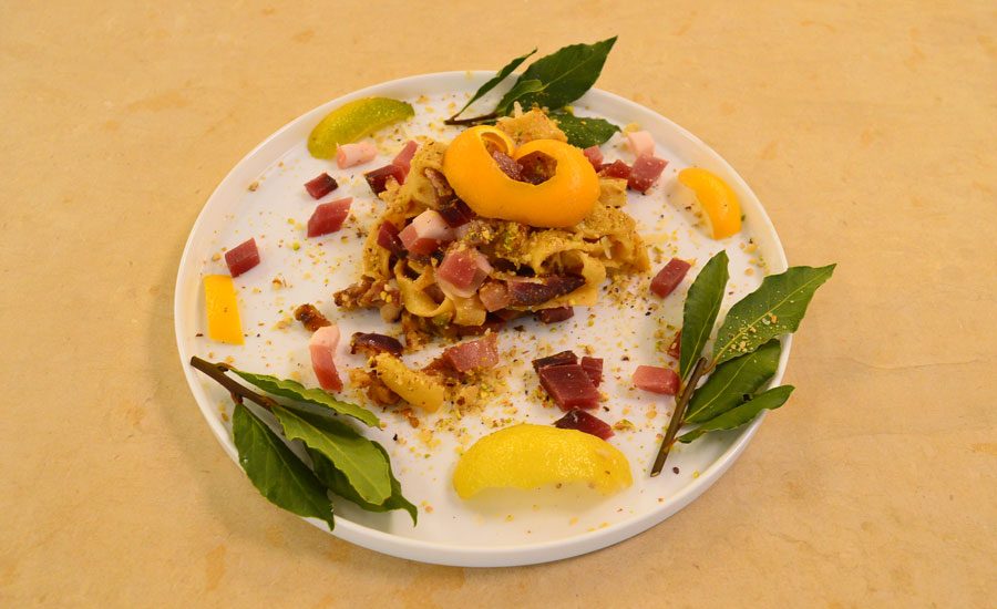 La Commissione: Il candidato presenta una tagliatella fatta a mano arricchita da un condimento originale e ben armonizzato, che unisce cipolla caramellata, mela, speck, frutta secca e melograno.