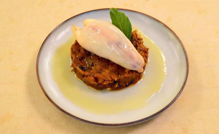 Calamaro ripieno con focaccia, uova, Parmigiano Reggiano, uvetta, pinoli e noce moscata. In accompagnamento, caponata con finocchio, melanzane e pomodoro, insaporita con aceto di vino bianco, concentrato di pomodoro, salsa di soia, pinoli e uvetta.