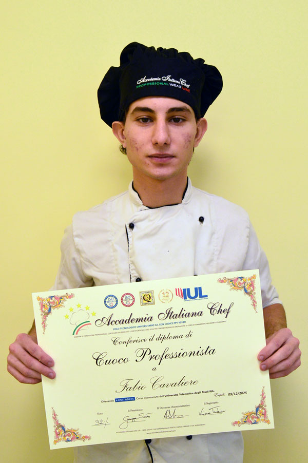 Il 9 Dicembre 2025 si è conclusa una sessione d’esame. Tredici allievi tra cucina, pasticceria e pizzeria hanno svolto il loro corso di formazione presso l’Accademia Italiana Chef e lo stage presso una struttura convenzionata conquistando con pieno merito il diploma professionale.