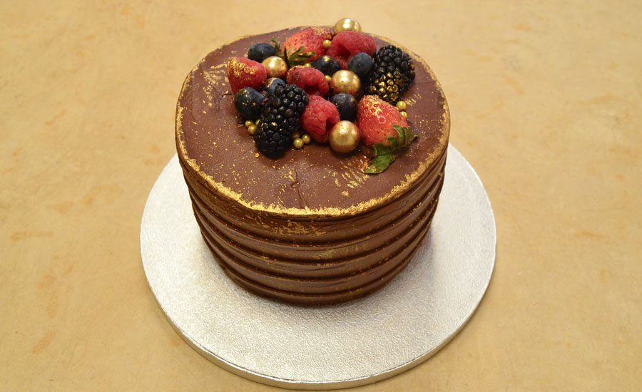 Copertura con ganache composta da cioccolato al latte e fondente, panna fresca, miele, burro e zucchero a velo.