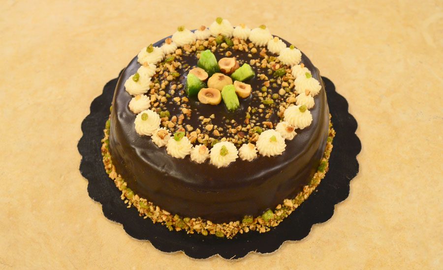 Il dolce è rivestito con ganache al cioccolato fondente a base di panna, miele e burro, e decorato con frosting di mascarpone, zucchero a velo, formaggio spalmabile e panna montata. La decorazione finale valorizza la nocciola in più consistenze: in pasta, in granella, intera e spezzata, con l’aggiunta di pomeranza disidratata.