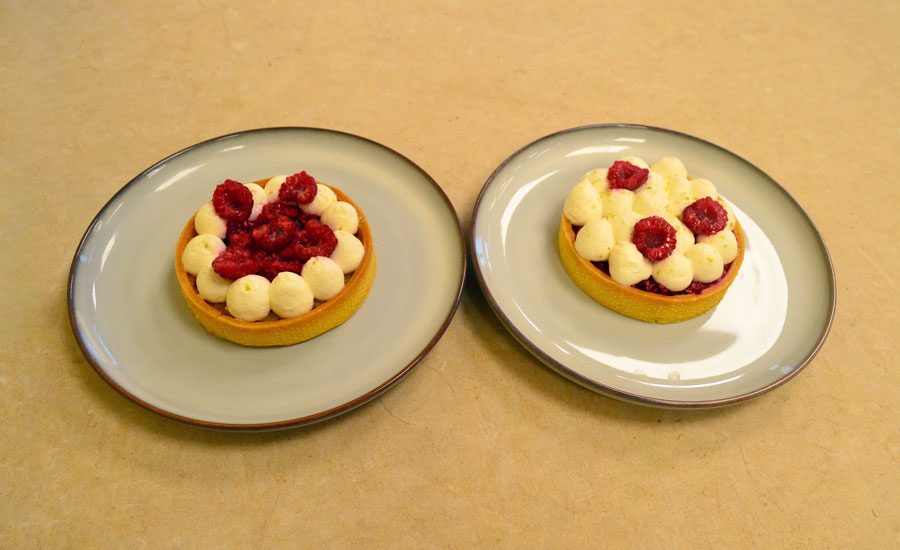 La Commissione: La candidata presenta una tarte composta da una frolla ben eseguita, frangipane alle mandorle e una crema al mascarpone e cioccolato bianco equilibrata e delicata. La decorazione di lamponi valorizza l’insieme, conferendo freschezza ed eleganza.