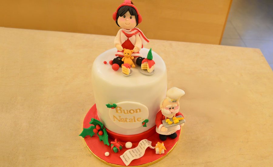 Torta tiramisù decorata: base mollycake o pan di Spagna con panna; struttura a più dischi di pan di Spagna bagnati al caffè, alternati a crema al mascarpone con tuorli e panna montata. Ogni strato è arricchito da sciroppo e polvere di cacao. La torta presenta due strati di farcitura stabilizzata, stuccatura con crema al burro al caffè e rivestimento in pasta di zucchero alla vaniglia. Decorazioni realizzate a mano in pasta di zucchero (bambina e Babbo Natale).