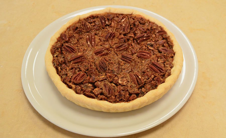 Pecan Pie: frolla magra realizzata con farina, burro, acqua e sale. Ripieno a base di uova, burro fuso, sciroppo d’acero, zucchero di canna e zucchero di cocco, con gherigli di noci pecan tritati. Decorazione finale con gherigli di pecan interi.