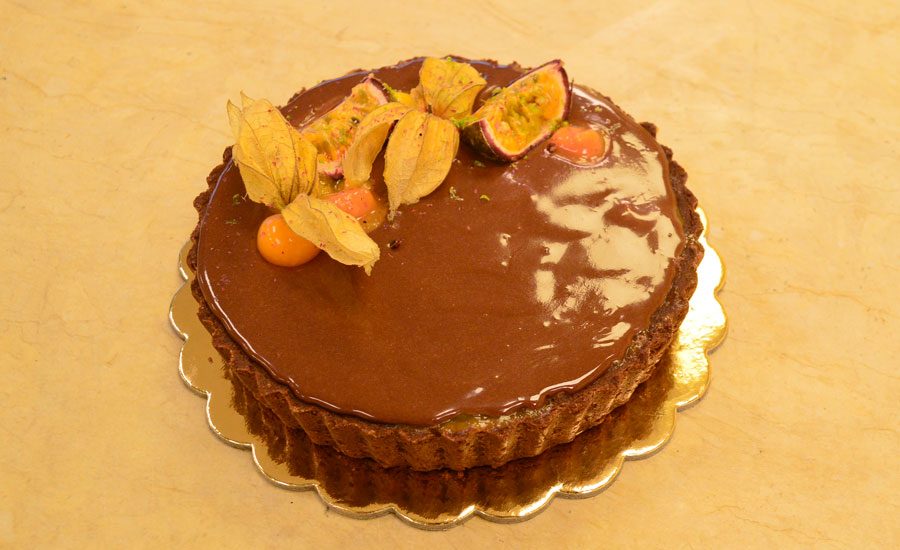 Base di frolla al cioccolato, cremoso al cioccolato fondente al 52% arricchito da frutta esotica (mango, papaya, passion fruit e ananas) e pepe rosa, il tutto ricoperto da ganache al cioccolato fondente.