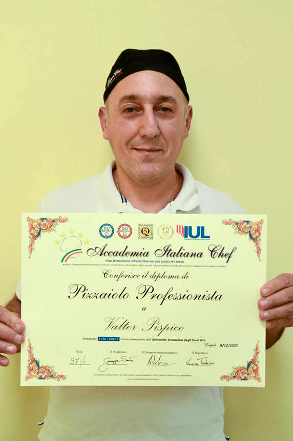 Nella sessione d’esame si è diplomato anche 1 bravissimo pizzaiolo: Valter Pispico al quale è stato riconosciuto il diploma Accademico. Il Neo Diplomato ha dimostrato di aver raggiunto un ottimo livello di competenze professionali che gli consentiranno di affrontare con successo la carriera lavorativa futura. Il Diploma di Pizzaiolo Professionista è stato conseguito dall’allievo dopo un percorso di lezioni teorico-pratiche presso l’Accademia, uno stage di 200 ore presso una Pizzeria, al quale poi ha fatto seguito la prova d’esame. Il bagaglio di conoscenze appreso sarà ora necessario per entrare nel mondo del lavoro, sia in Italia che all’estero.