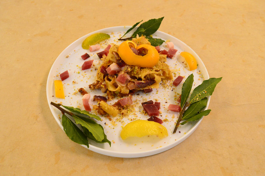 La Commissione: Il candidato presenta una tagliatella fatta a mano arricchita da un condimento originale e ben armonizzato, che unisce cipolla caramellata, mela, speck, frutta secca e melograno.