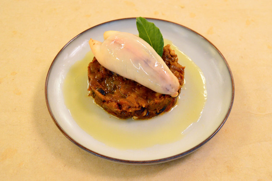 Calamaro ripieno con focaccia, uova, Parmigiano Reggiano, uvetta, pinoli e noce moscata. In accompagnamento, caponata con finocchio, melanzane e pomodoro, insaporita con aceto di vino bianco, concentrato di pomodoro, salsa di soia, pinoli e uvetta.