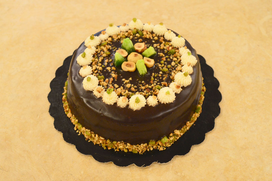 Il dolce è rivestito con ganache al cioccolato fondente a base di panna, miele e burro, e decorato con frosting di mascarpone, zucchero a velo, formaggio spalmabile e panna montata. La decorazione finale valorizza la nocciola in più consistenze: in pasta, in granella, intera e spezzata, con l’aggiunta di pomeranza disidratata.