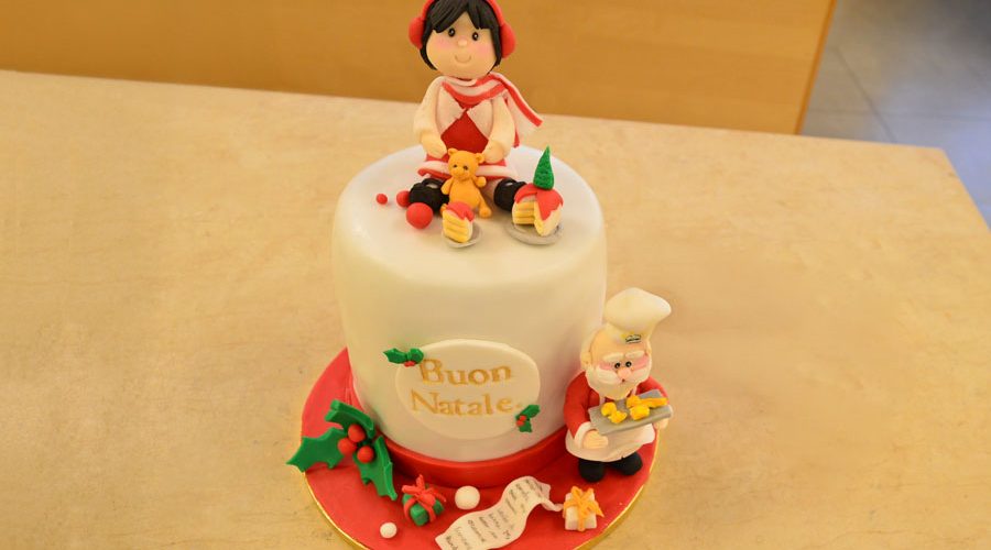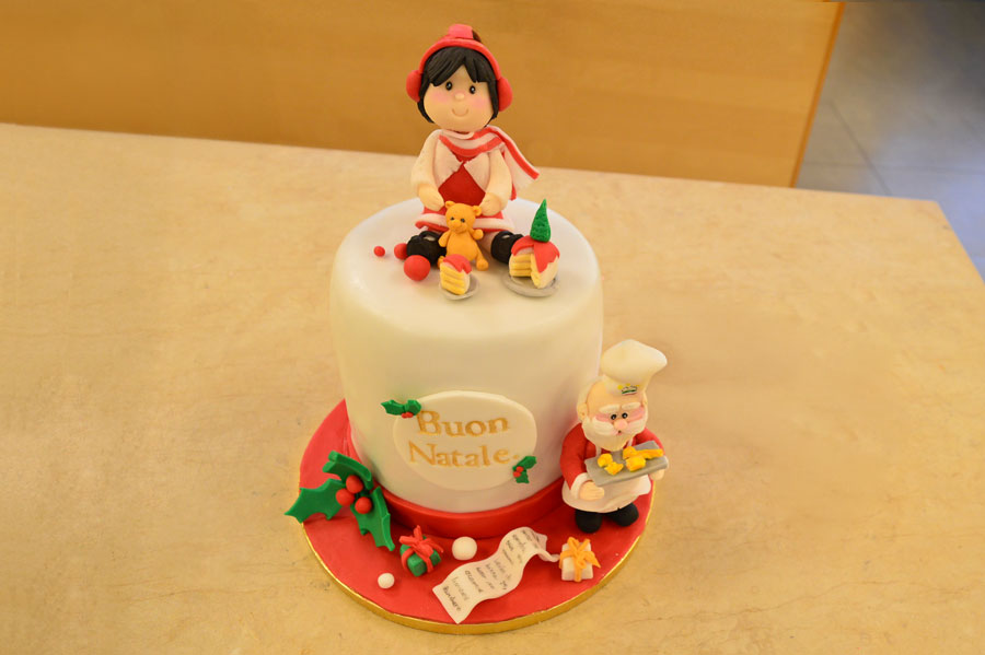 Torta tiramisù decorata: base mollycake o pan di Spagna con panna; struttura a più dischi di pan di Spagna bagnati al caffè, alternati a crema al mascarpone con tuorli e panna montata. Ogni strato è arricchito da sciroppo e polvere di cacao. La torta presenta due strati di farcitura stabilizzata, stuccatura con crema al burro al caffè e rivestimento in pasta di zucchero alla vaniglia. Decorazioni realizzate a mano in pasta di zucchero (bambina e Babbo Natale).