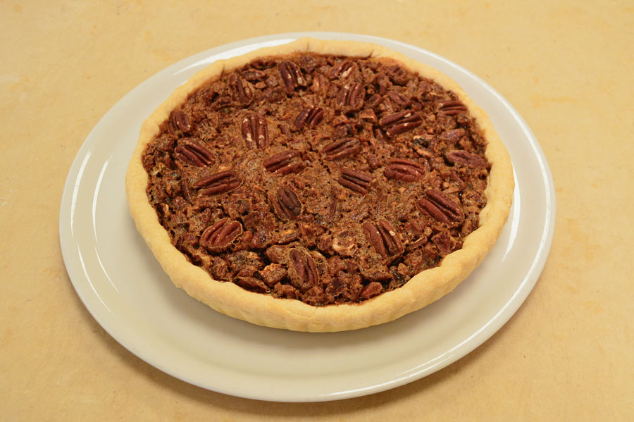 Pecan Pie: frolla magra realizzata con farina, burro, acqua e sale. Ripieno a base di uova, burro fuso, sciroppo d’acero, zucchero di canna e zucchero di cocco, con gherigli di noci pecan tritati. Decorazione finale con gherigli di pecan interi.