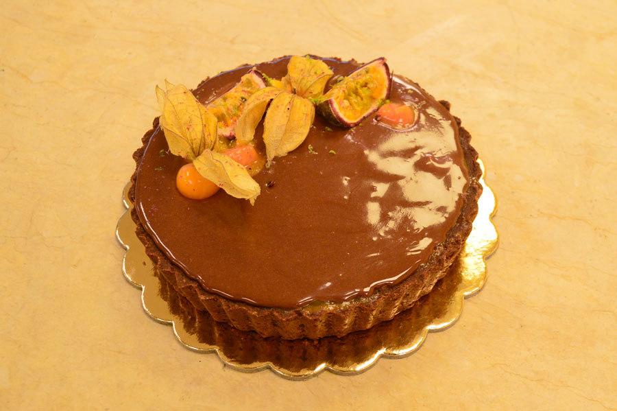 Base di frolla al cioccolato, cremoso al cioccolato fondente al 52% arricchito da frutta esotica (mango, papaya, passion fruit e ananas) e pepe rosa, il tutto ricoperto da ganache al cioccolato fondente.