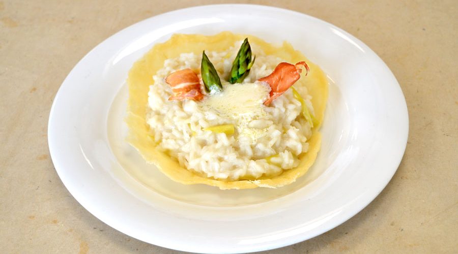 Per la precottura:Faccio rosolare lo scalogno in padella bassa e ampia con un filo d’olio di oliva, dopo aggiungo il riso e lo faccio tostare, sfumo con il vino e dopo aggiungo gli asparagi verdi gia sbucciati e tagliati e bagno con il brodo vegetale. Continuo la precottura la metà del tempo espresso per il riso carnaroli. Lascio raffreddare il riso precotto e dopo di che inizio a sgranarlo. Inizio a pelare gli asparagi e con le loro bucce andiamo a creare il brodo vegetale unendo anche il sedano, la carota, la cipolla, l’ alloro e i chiodi di garofano. Nel frattempo che faccio sobbollire il brodo metto a scaldare la padellina antiaderente in cui preparo il cestino di parmigiano con il quale andremo ad abbellire la presentazione del piatto. Metto al forno la fetta di prosciutto crudo per renderla croccante e che aggiungerò all’ impiattamento. A questo punto aggiungo il riso precotto nella pentola e inizio a bagnarlo per 5 min con il brodo poco alla volta. Una volta che è pronto spengo il fuoco e manteco il riso.