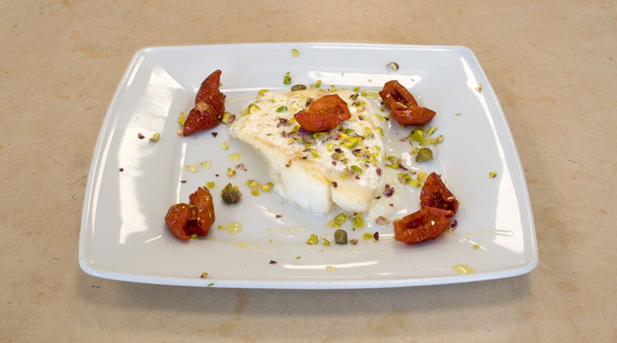 Tritare i pistacchi a coltello. Condire i pomodori secchi ammollati con un poco di olio EVO. Non occorre salare nessun elemento del piatto perché tutti i componenti hanno una loro intrinseca sapidità. Comporre il piatto mettendo un letto di crema di mozzarella , sopra il trancio di baccalà, ricoprire il baccalà con abbondante crema di mozzarella e con i pistacchi tritati. Aggiungere al piatto i pomodorini e i capperi, servire ben caldo.