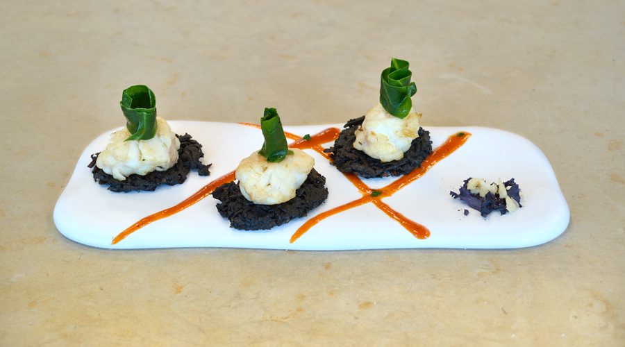 Passiamo alla preparazione delle patate al nero di seppia, la base sulla quale poi appoggiare il pesce etc. Sbucciare le patate e grattugiarle In una boule con una grattugia a fori grandi. Asciugarle ed unire la sacca di nero di seppia, unire l’erba cipollina e mischiare ben bene il tutto. Mettere l’olio sul fuoco in una padella antiaderente e quando è caldo posizionaci i 3 coppapasta mettendo all’interno di ciascuno uno strato del preparato di patate al nero di seppia, aggiustare di sale e pepe. Friggere per 3-4 minuti per ciascun lato. Togliere dal fuoco ed appogiare su un fazzoletto per asciugarle dall’olio. Pulire le bietole e privarle del gambo. Sbollentarle per 2 minuti in acqua salata quindi passarle repentinamente in una bacinella con acqua e ghiaccio. Al momento dell’impiattamento asciugarle con un panno morbido e condirle con olio e sale. Si passa poi alla composizione ed all’impiattamento, a vostro piacimento.