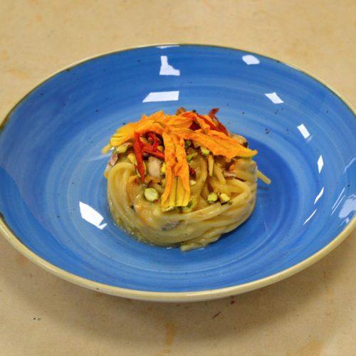 Cuocere gli spaghetti per 7 minuti, nel frattempo un una padella mettere aglio, peperoncino, olio, far andare per 1 minuto e poi aggiungere l’acqua di pomodoro. Passati i 7 minuti aggiungere la pasta e se serve ancora acqua di pomodoto e lasciare cuocere per altri 5 minuti circa. Poi aggiungere la crema di zucchine, le vongole, e l’acqua di cottura delle vongole, pepe, sale e mantecare per un paio di minuti. Aggiustare di sapore e impiattare aggiungendo la granella di pistacchi e i fiori di zucca.
