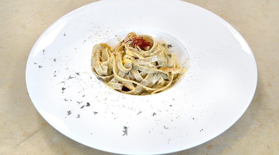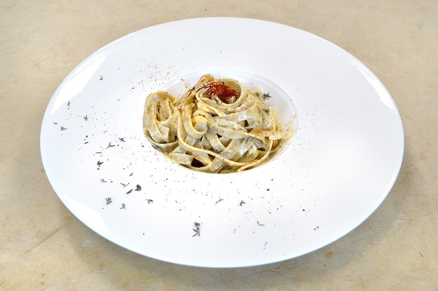 Useremo un piatto cappello di prete in modo da poter distribuire al meglio la fonduta che verrà servita in un brick quindi nella parte fonda del piatto metteremo il burro lardellato che abbiamo usato come fondo per la pasta con dell’aggiunta di fonduta di bufala. Avvolgeremo a nido i lunghi saraceni con il magro, qualche fogliolina di timo e la restante salsa di burro lardellato e per finire dei pistilli di zafferano una macinata di pepe verde e nel bricchetto logicamente ci sarà della fonduta di bufala che ognuno potrà aggiungere a suo piacimento