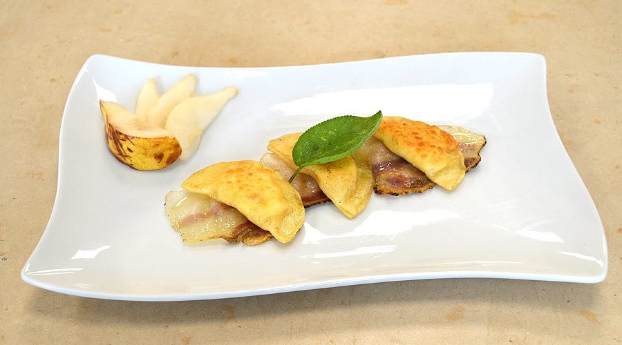 Criticità: La scelta degli ingredienti risulta fondamentale specie sul ripieno del raviolo, poiché ne può alterare il sapore finale, ad esempio, se viene adoperata una pera non troppo matura, dunque dura e poco dolce, ne può compromettere il sapore agrodolce desiderato. Inoltre si consiglia per la pancetta di utilizzare fette appena più spesse di quelle che si trovano già confezionate.