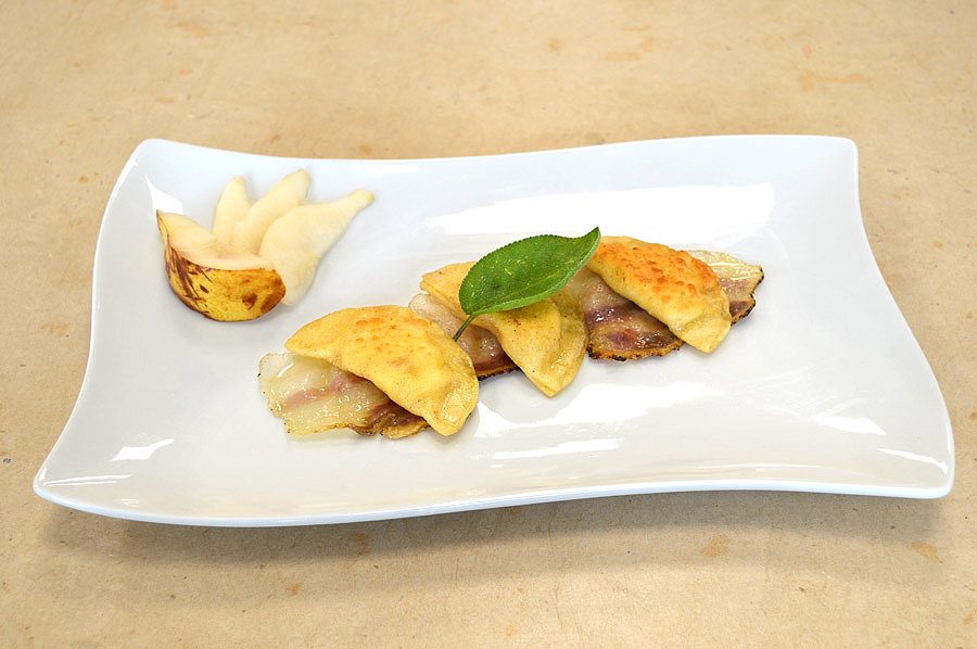 Utilizzando un piatto piano ponete la pancetta nel mezzo, poi sopra disponete tre mezzelune, cercando naturalmente di coprire tutta la lunghezza della pancetta. Infine disponete a ventaglio tre fette non troppo massicce di pera su uno dei lati del piatto ed una foglia di salvia sulla mezzaluna intermedia.