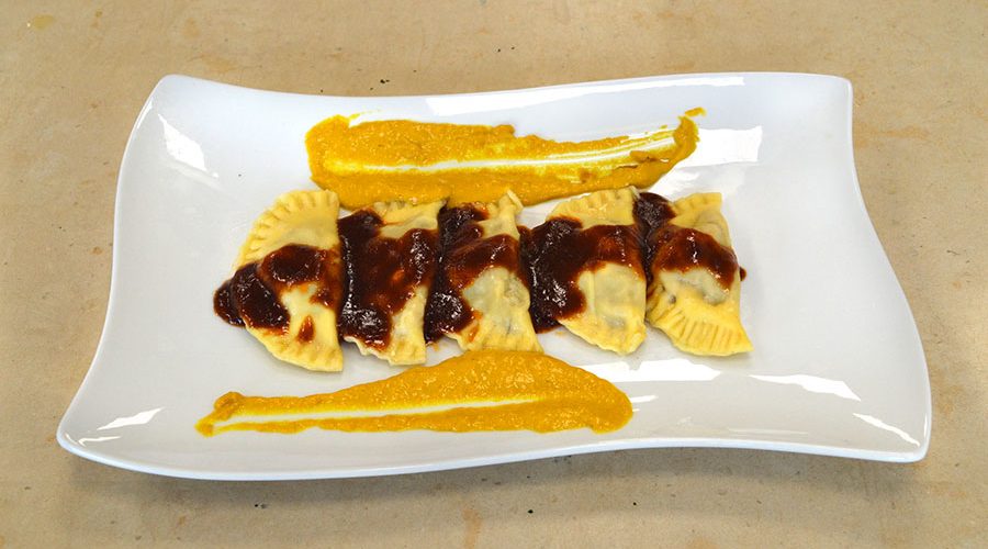 Setacciare e disporre la farina a fontana sul piano di lavoro, poi formare un incavo nel centro e rompetevi le uova aggiungendo un cucchiaio di olio EVO. Cominciando dall’interno mescolate le uova con una forchetta, prendendo man mano la farina dai bordi. Lavorate con le mani l’impasto dall’esterno verso l’interno, amalgamando tutta la farina che si trova sul piano di lavoro quindi aggiungete lo zafferano. Dividere in 2 l’impasto e lavorarlo finchè non sarà liscio e omogeneo. Correggete se necessario con farina o acqua qualora l’impasto risulti rispettivamente troppo appiccicoso o asciutto. Avvolgete l’impasto con la pellicola da cucina e riporre in frigo per almeno un’ora. Trascorso tale tempo stendete la sfoglia con la macchina per la pasta allo spessore desiderato; ritagliate dei cerchi con l’aiuto di uno stampo e disponete al centro un cucchiaio di ripieno, infine chiudete le mezzelune pressando i bordi con una forchetta.Cuocere in abbondante acqua salata le mezzelune per circa 10 minuti.
