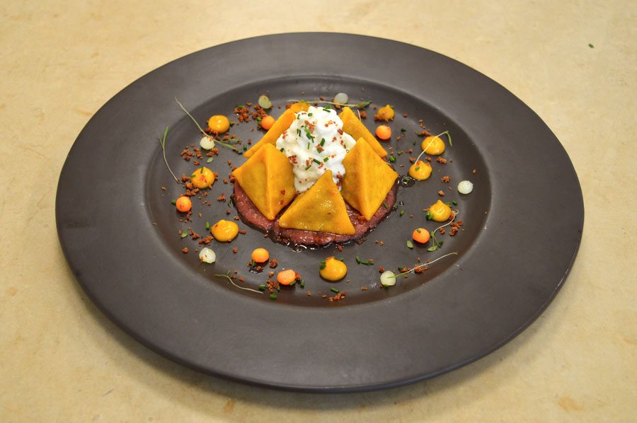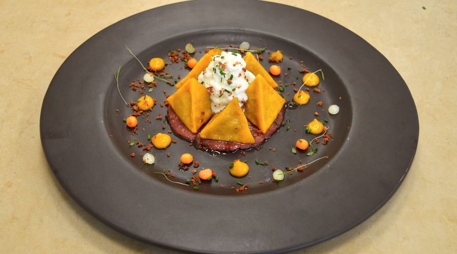 Mettete a bollire l’acqua per i ravioli, salate, nel frattempo prendete i piatti, disponete la tartare al centro, nel frattempo scaldate la salsa genovese e le verdurine con il microonde, ponete una padella sul fuoco e fate scaldare il fondo bruno, cuocete le piramidine, circa 2 minuti, scolatele e versatele nel fondo bruno, condire bene e posizionarle sul piatto circolarmente sopra la tartare, sifonare al centro la spuma, mettere le palline di verdure intorno, fare dei puntini, più o meno grandi con la salsa genovese, spolverare con la pancetta croccante e guarnire con erbette e germogli.