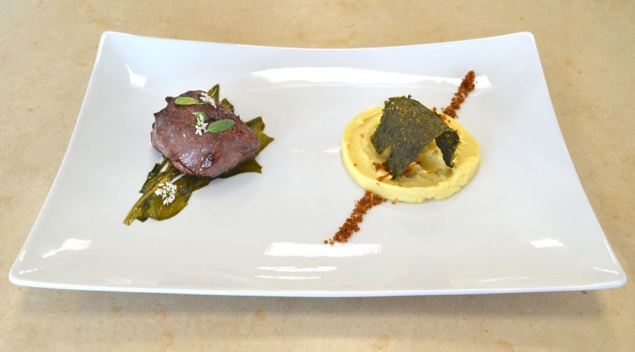 Per la polvere di guanciale: friggere le fette di guanciale in olio bollente per 1 minuto, poi lasciarle asciugare bene su carta da forno. Passarle in forno per 1 ora a 70°, lasciarle asciugare nuovamente. Tritarle con un frullatore fino ad ottenere una polvere. Friggere qualche secondo le foglie di salvia in olio bollente, evitando che anneriscano. Togliere la carne dal sottovuoto e rianimarla per 3 minuti in una padella su fiamma vivace con una noce di burro e il suo sugo.