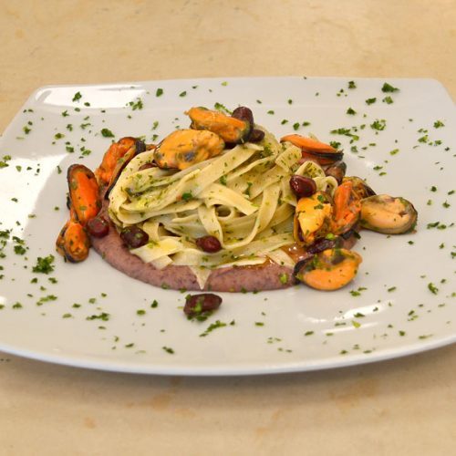 Una volta pronti tutti gli ingredienti potremo cominciare a preparare in una padella il prossimo soffritto con dell’EVO, aglio, peperoncino, le cozze e i fagioli interi tenuti da parte precedentemente. Sfumiamo con del vino bianco e aggiungiamo il prezzemolo. Preparare i piatti con dei nidi di purea di fagioli sul fondo dove adageremo sopra le porzioni di pasta.