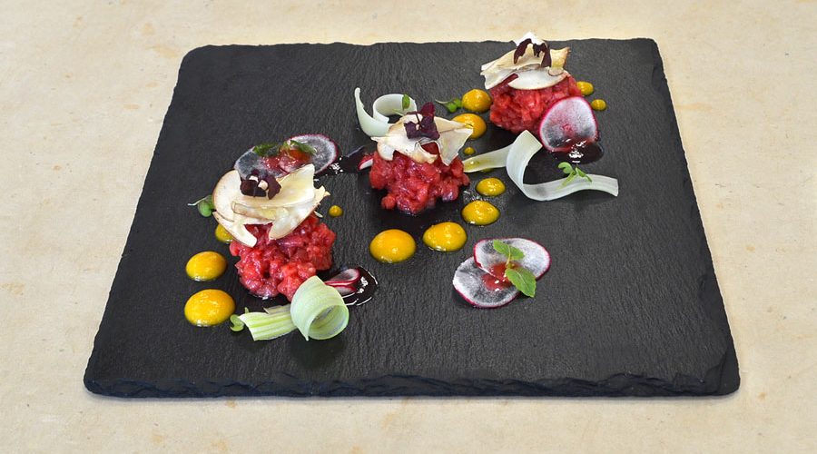 Disporre per ogni piatto tre porzioni di carne, dando una forma di piccola cupola, su ognuna di esse disporremo i funghi ed il sale Maldon. Il piatto verrà guarnito con crema di peperoni, ravanelli, sedano, aceto di lamponi e germogli a foglia.