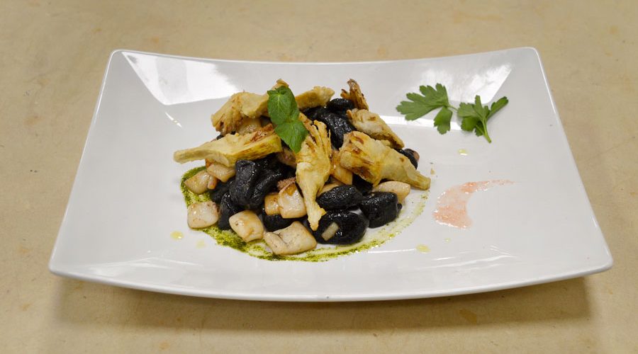 Mettere acqua a bollire in pentola, fare scaldare l’olio di arachidi in un pentolino. Sbucciare l’aglio, privare dell’anima, tagliare cipolla a dadini, pulire carciofi e tagliare. In un becher unire olio evo con prezzemolo e menta precedentemente puliti. In una padella far scaldare l’olio evo con lo spicchio d’aglio, aggiungere cipolla, una volta ammorbidita unire le seppie tagliate a strisce, rosolare e sfumare con vino bianco. Buttare gli gnocchi (preparati precedentemente unendo all’impasto le sacche di nero) in acqua bollente salata. Friggere carciofi infarinati in olio di arachidi, asciugarli sulla carta paglia. Scolare gli gnocchi e saltarli in padella con le seppie.
