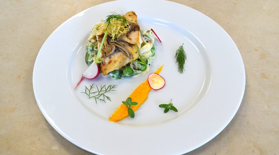 Impiattamento, piatto piano in un coppapasta mettiamo le verdure saltate posizionare sopra il filetto con qualche fungo e un po di salsa di cottura, con sopra le crisp di porri, aggiugere qualche cucchiaio di purea di carote e finire con ravanelli a fette e le erbe aromatiche.