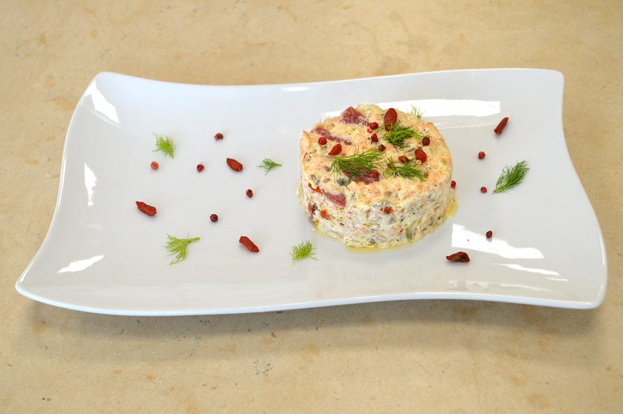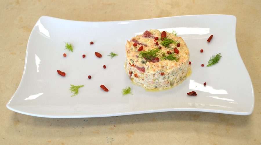 Una volta pronto, disporli con un coppa pasta sul piatto da portata, fare una piccola pressione con un cucchiaio per non che qundo si toglie il coppa pasta la messa in piatto degli gnocchi si disfi . In fine decorare con pepe rosa e barbetta di finocchio .