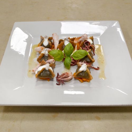 Con un cucchiaino, mettere ben disposte sul piatto 6 mezze sfere di crema di zucca precedentemente riscaldata . Mettere sopra i saccottini. Aggiungere gocce di prescinseua sopra i saccottini. Unire i calamaretti. A guarnizione, unire uno o due ciuffi di basilico.