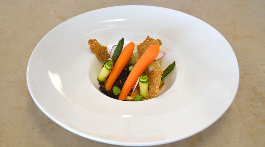 Posizionare pezzi piccoli di amaranto essiccato non fritto, ricoprire con mascarpone allo zafferano e cospargere delicatamente quest’ultimo con le terre. Utilizzare un coppa pasta per facilitare la stesura del mascarpone.Posizionare le verdure al vapore e le verdure affettate secondo proprio estro sulla base di mascarpone e affiancare le cialde di amaranto fritto.