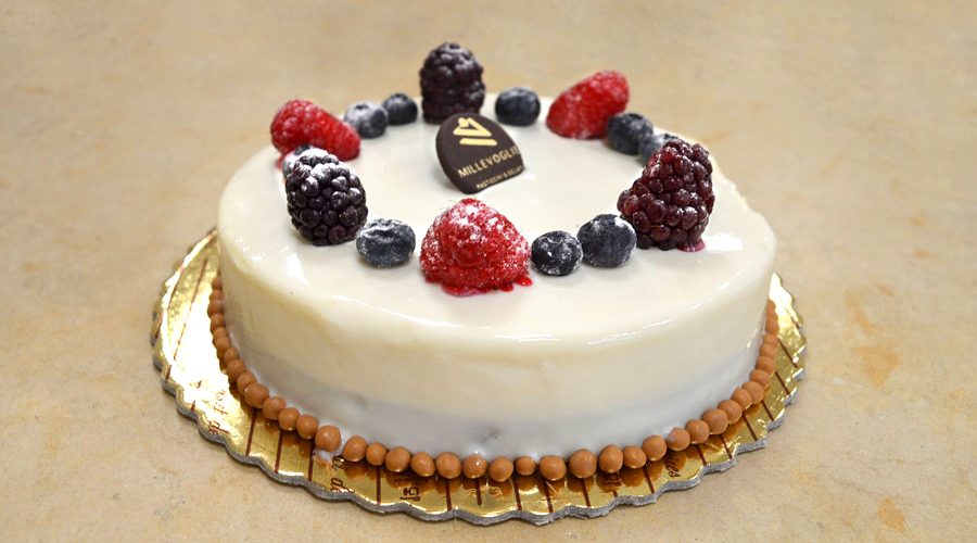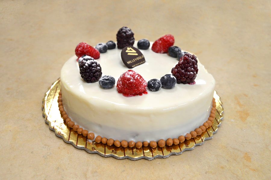 Colare il cioccolato bianco sulla torta e decorare con i frutti.