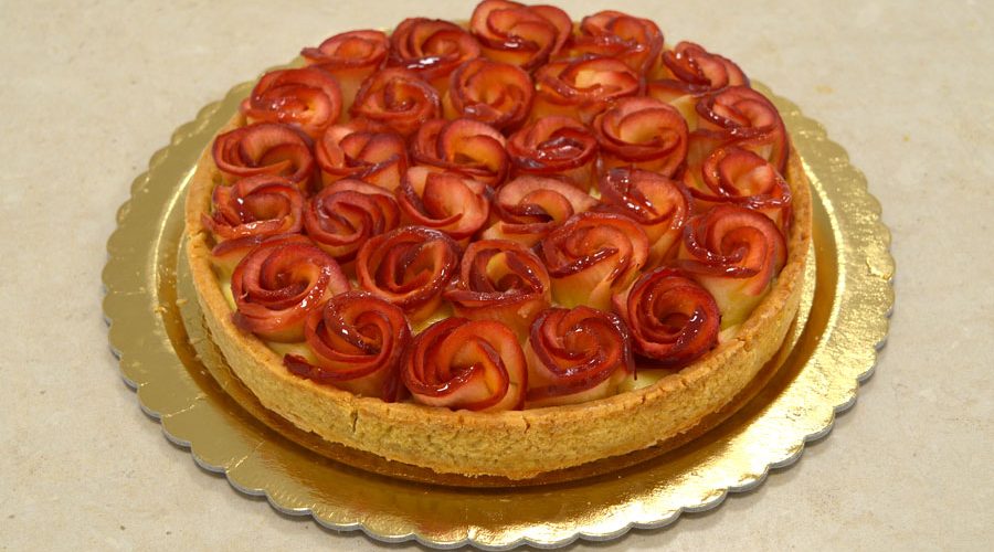 Per le roselline di mela: lavare le mele, tagliarle a metà ed eliminare il torsolo. Con una mandolina affettare le mele ad uno spessore di 1-2 mm. Preparare uno sciroppo scaldando l’acqua, lo zucchero, il succo di limone e, una volta raggiunto il bollore, immergere le fettine di mela un po’ alla volta per 3-4 minuti. Scolare le fettine di mela e lasciarle raffreddare e asciugare su una gratella foderata con un canovaccio pulito. Quando le mele saranno fredde, prenderne 5 e sovrapporle per metà ottenendo così una striscia di 15cm di lunghezza circa che deve essere arrotolata su se stessa per formare una rosa.