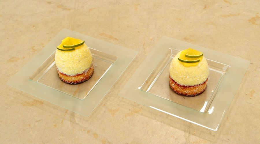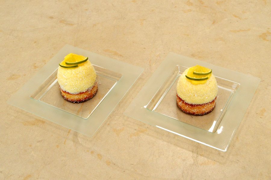 Nella planetaria con foglia, mescolare la ganache e la crema fino a diventare un composto liscio e versare in un sac à poche (1 minuto).Farcire le basi al cocco con abbondante ganache e ricoprire il tutto in modo uniforme con il cocco grattugiato, fare un buco al centro e guarnire con la crema pasticcera (3 minuti).Decorare le monoporzioni con delle fette di lime nella parte superiore (1 minuto).