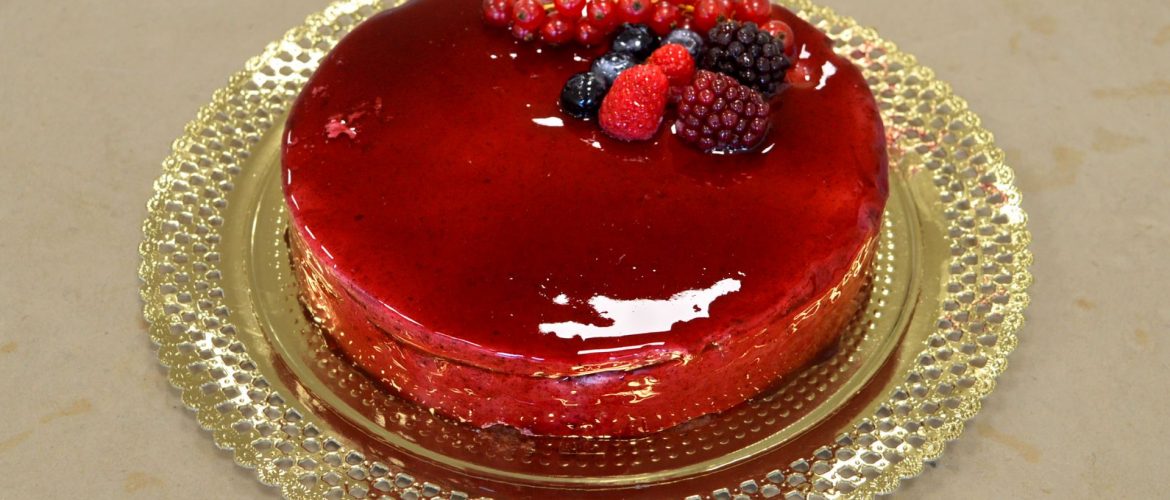 Applicare la glassa per coperture a specchio “miroir neutre” unita a della polpa ai frutti di bosco. Infine, completare la mousse decorando con frutta.