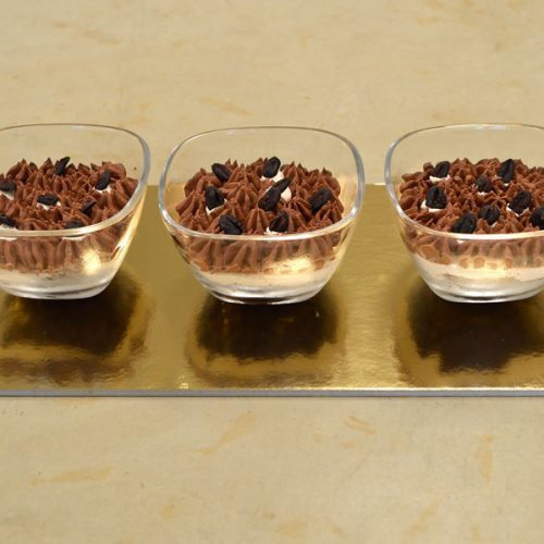 Composizione del dolce: prendere il pan di spagna al cacao e ricavare dei quadrati da mettere sul fondo delle coppette. Bagnarlo con la bagna al caffè. In una sac a poche mettere il cremoso al caffè e realizzare uno strato sopra il pan di spagna. Prendere lo strato di cioccolato, ricavare dei quadrati e adagiare sopra il cremoso al caffè. Infine in una sac a poche mettere la mousse al cioccolato e realizzare dei ciuffi sopra lo strato sottile di cioccolato.