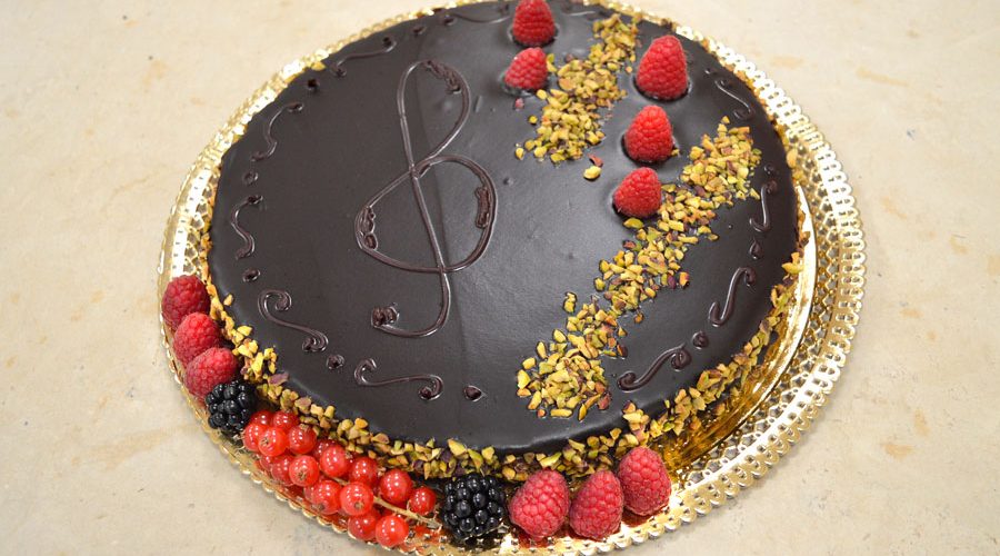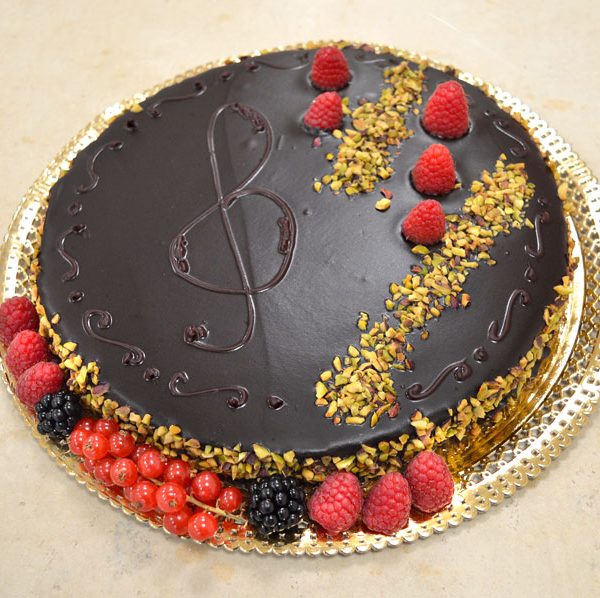 Decora con il pistacchio triturato e la frutta, a proprio piacemento se usare il cioccolato per ulteriori decori.